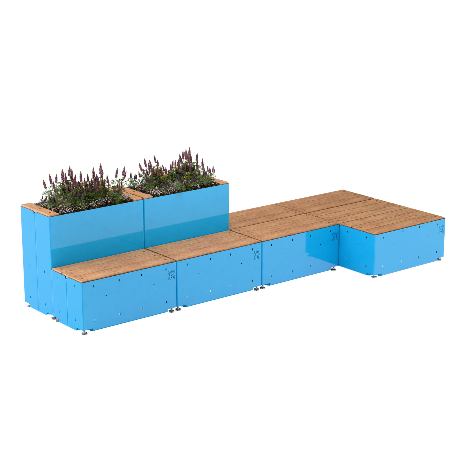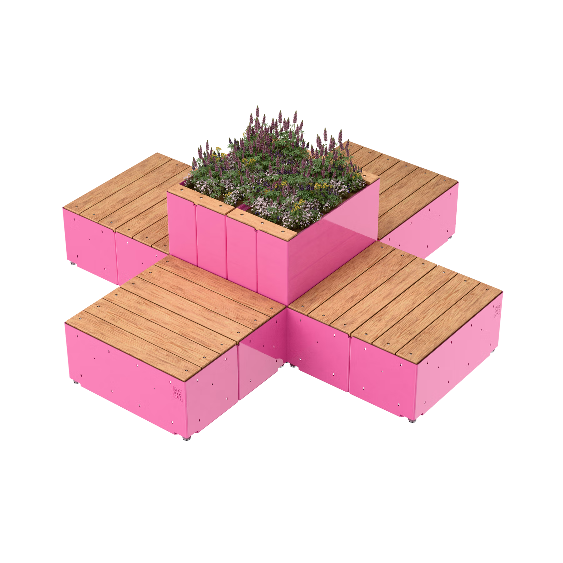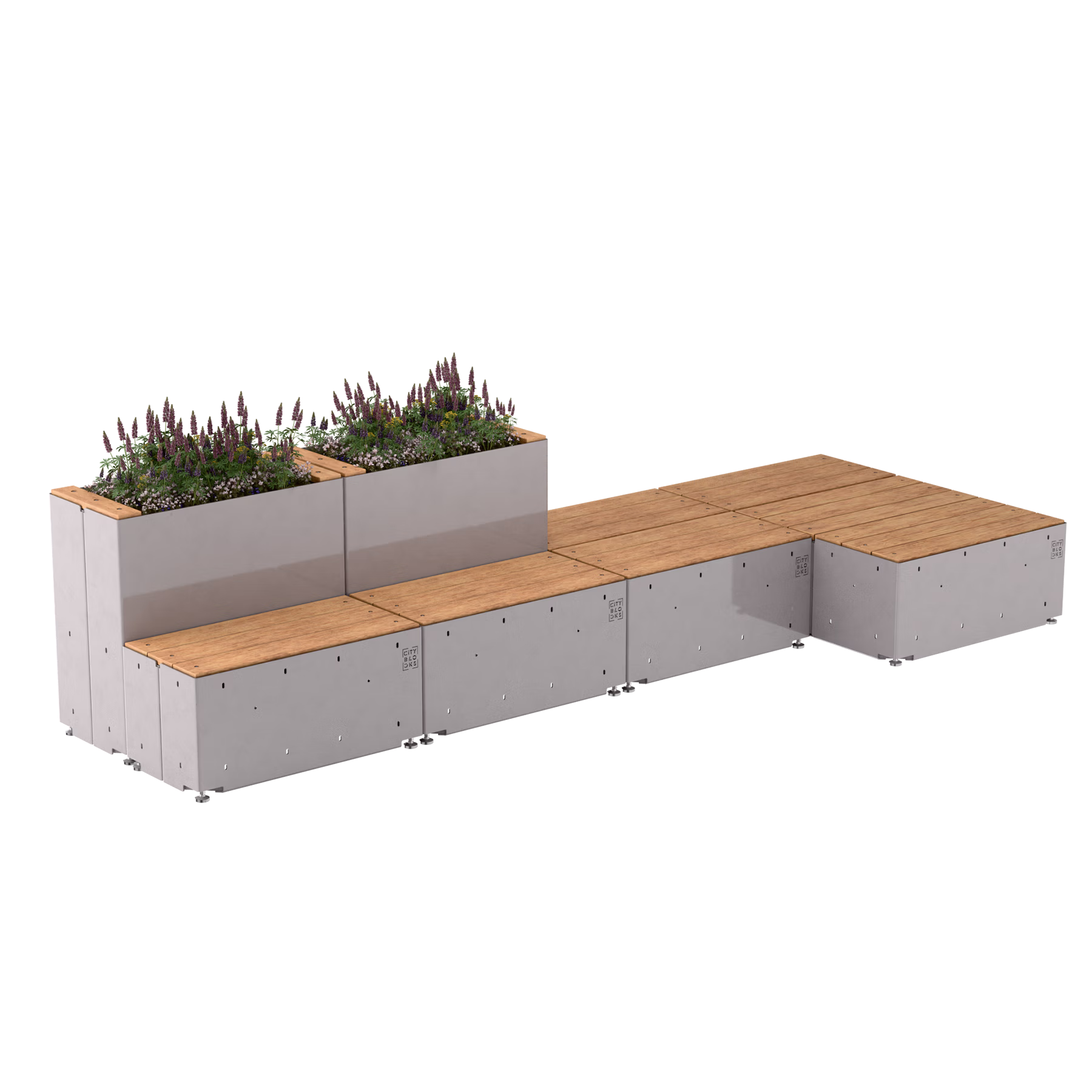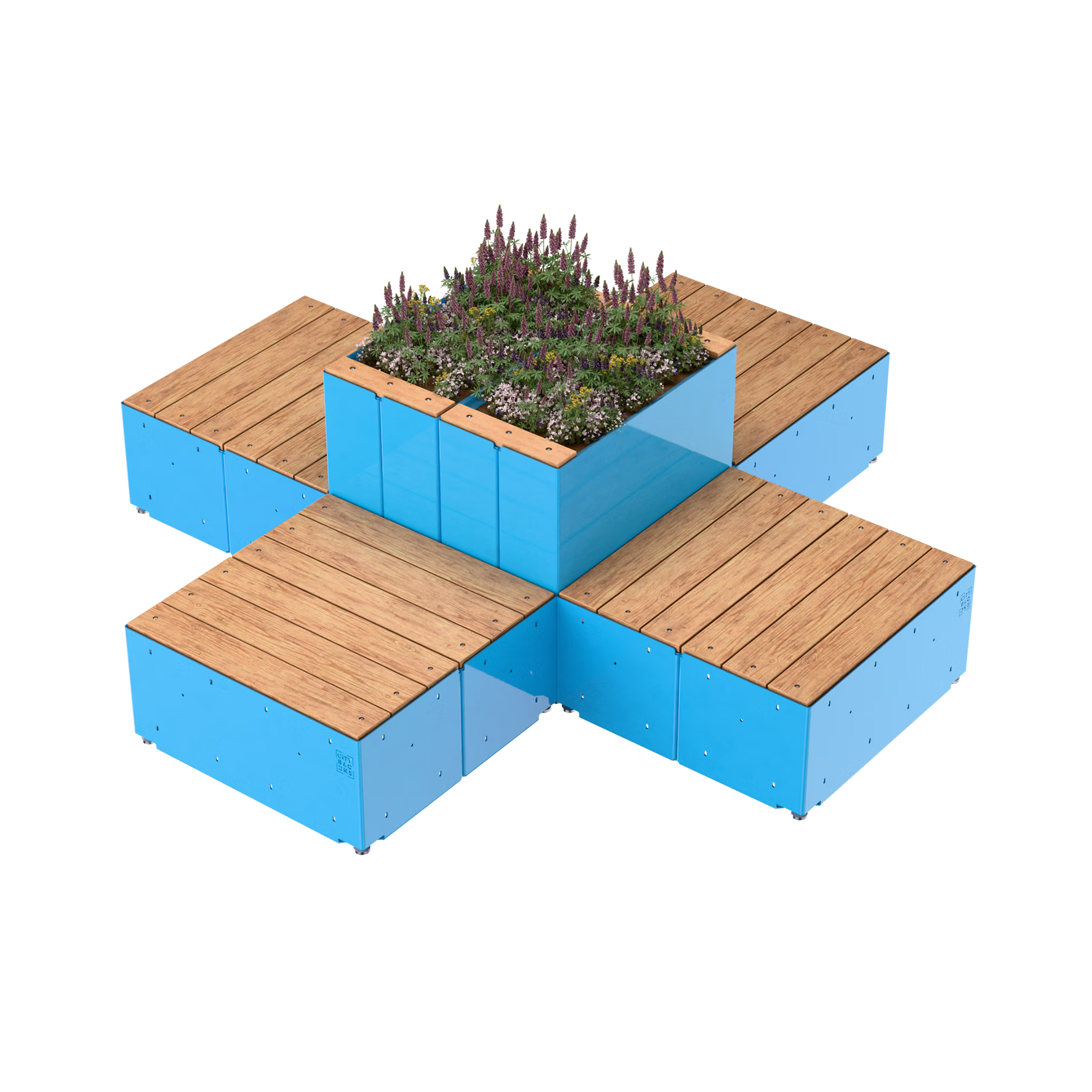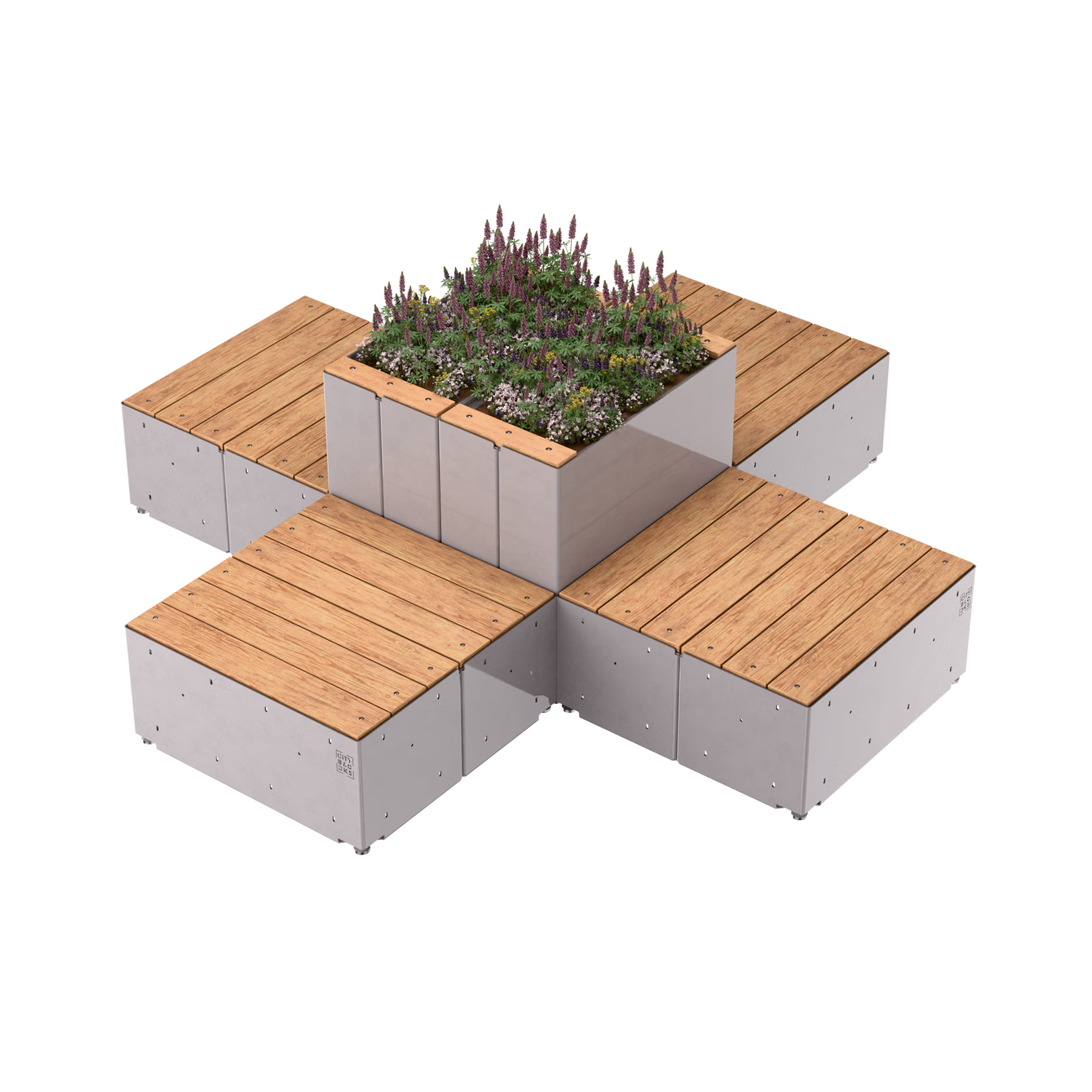"Hoi polloi" is an Ancient Greek phrase meaning "the many" or "the masses." This configuration is perfect for seating "the many" all at once in common spaces – as a room centrepiece or placed strategically around open exteriors. Extend it by adding more rectangle blocks in the centre to create an elegant urban space for even more people.