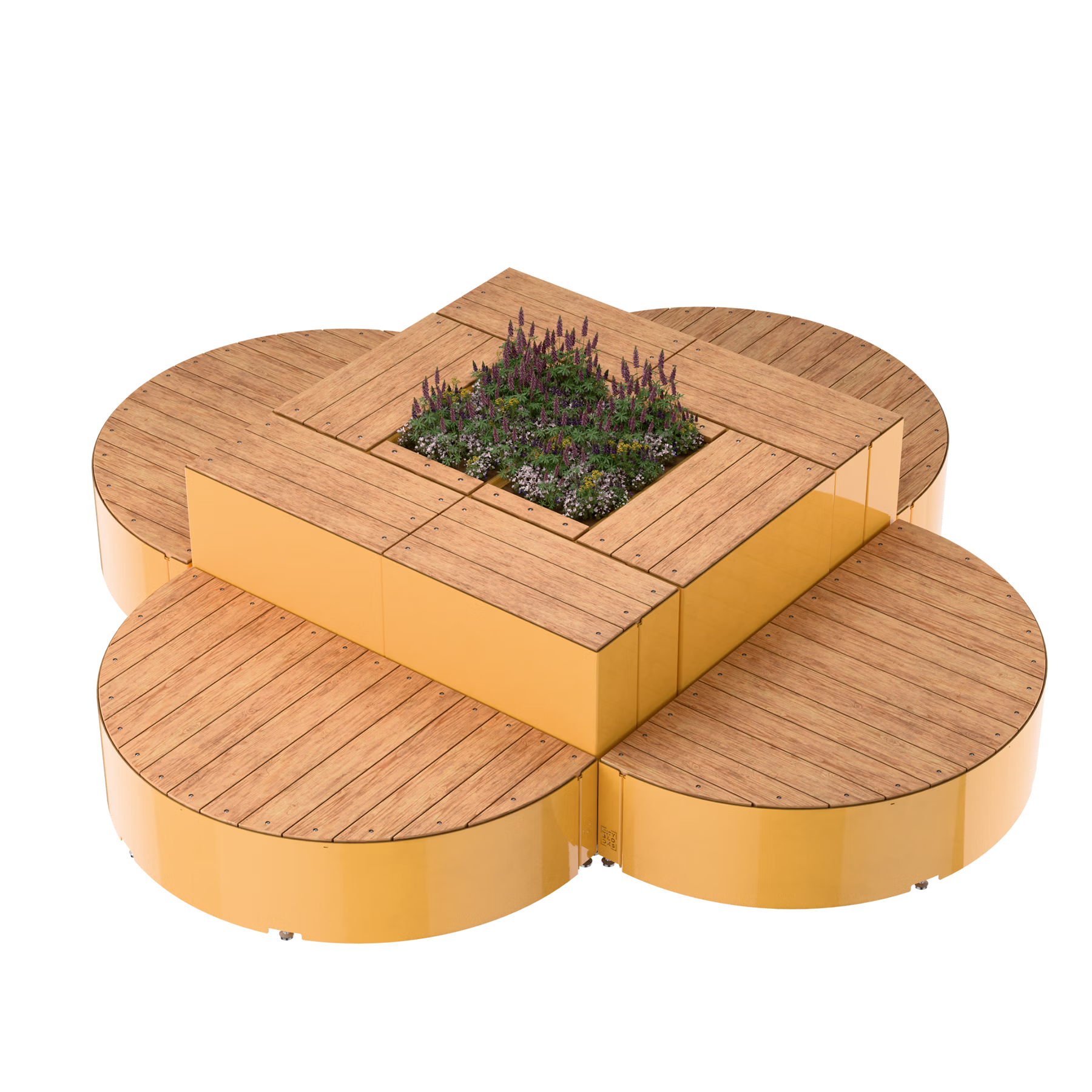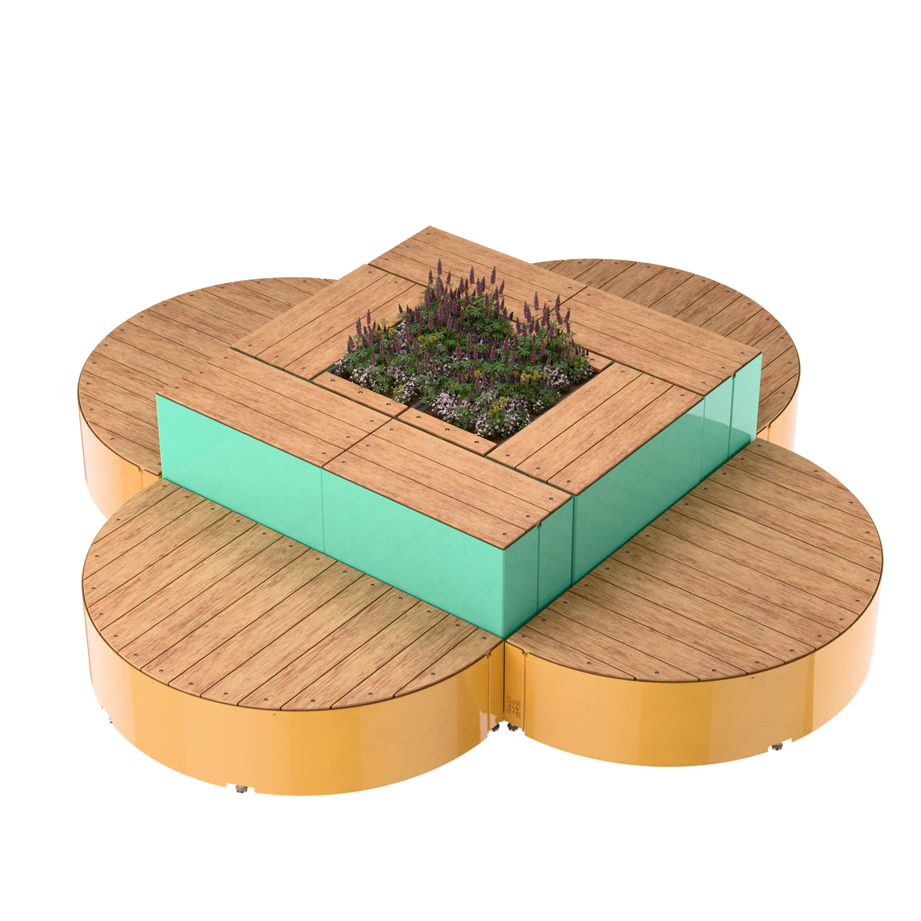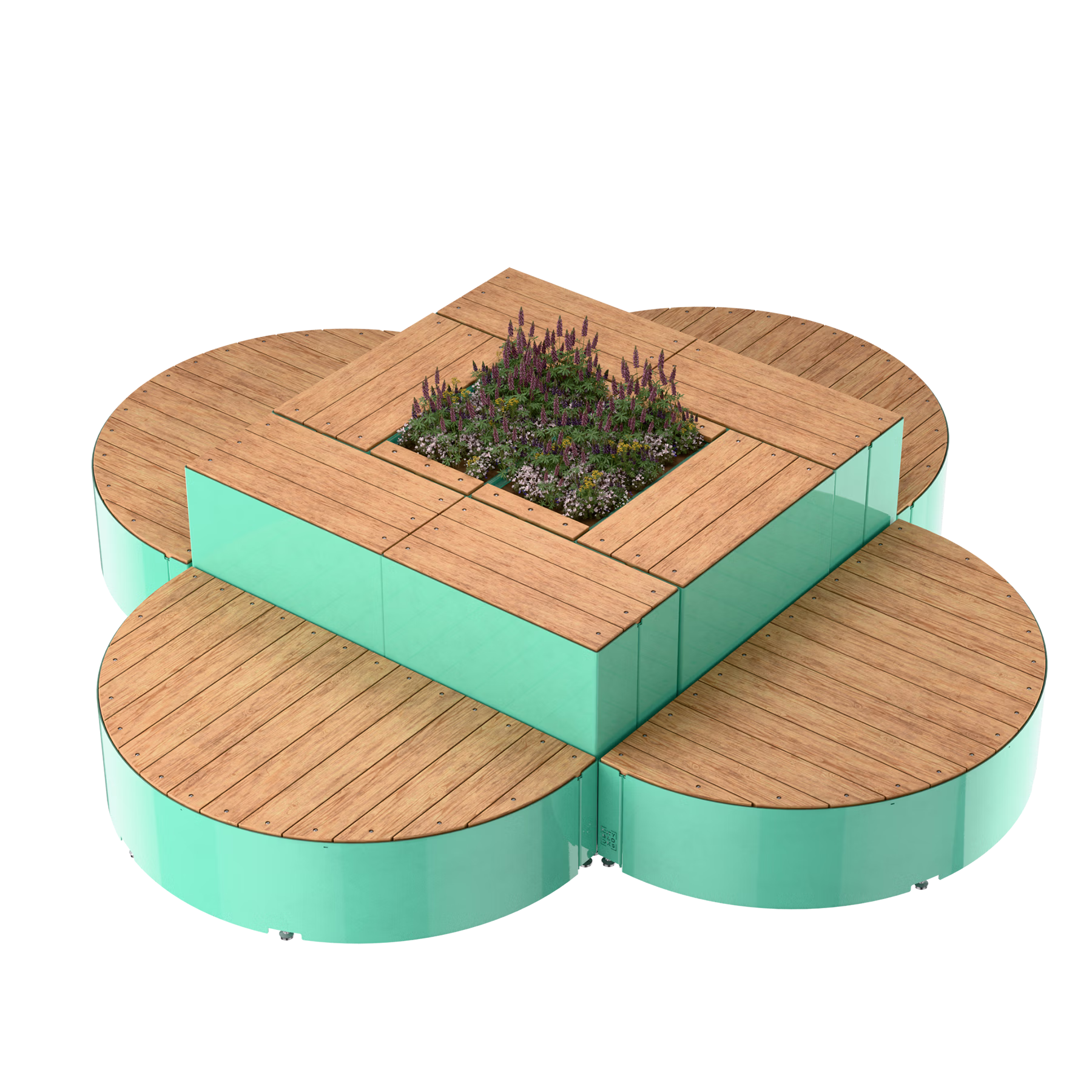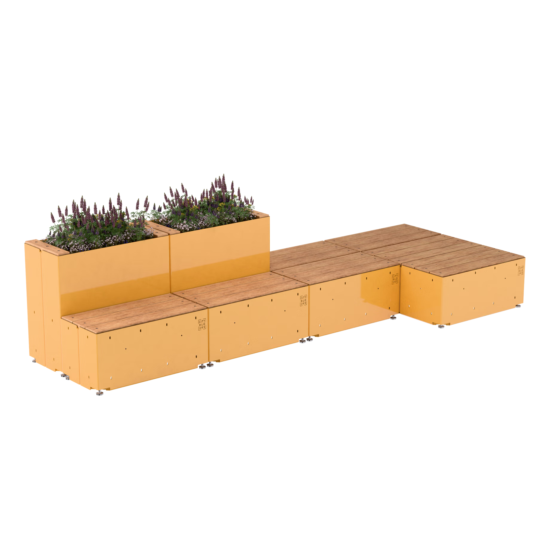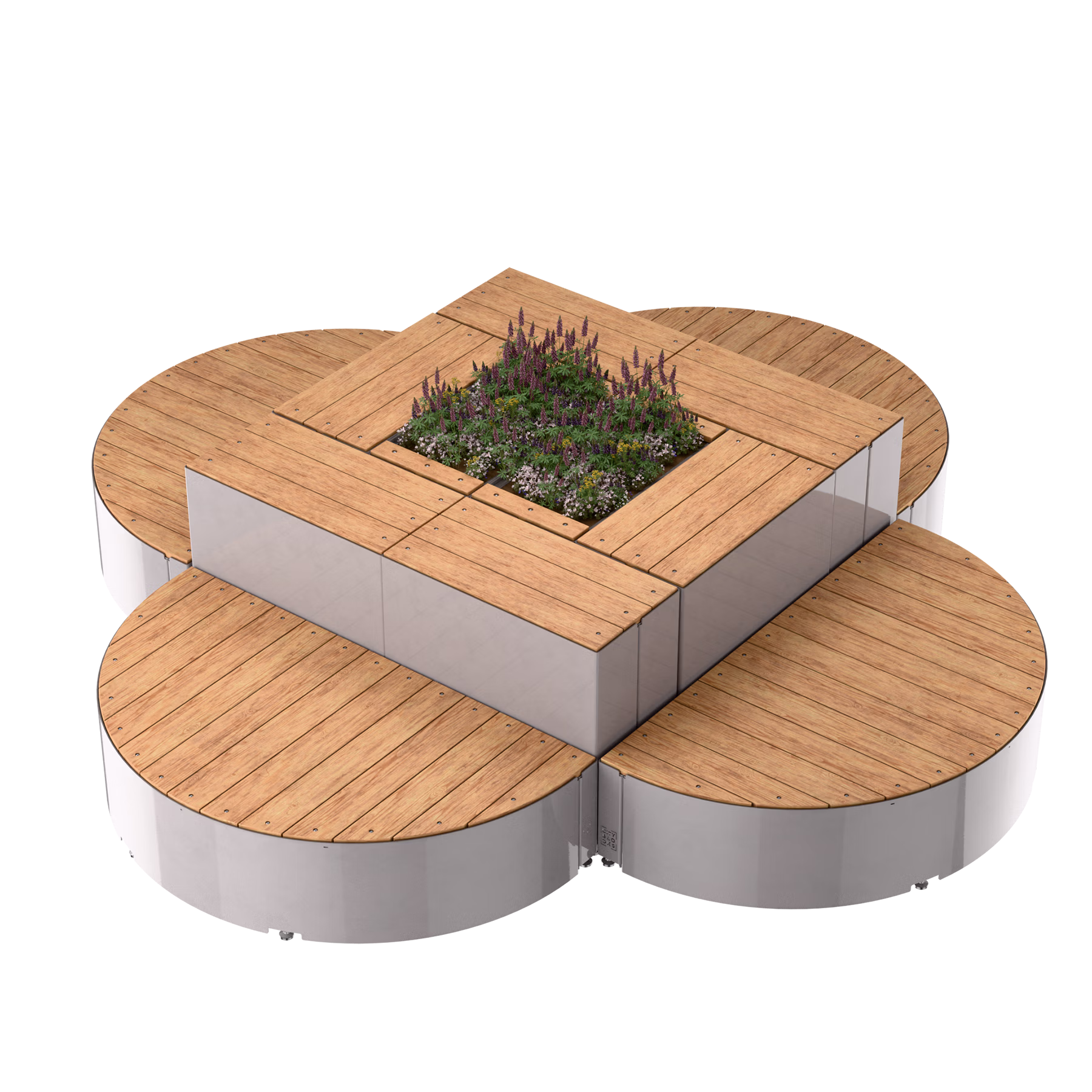"Hoi polloi" is an Ancient Greek phrase meaning "the many" or "the masses." This configuration is perfect for seating "the many" all at once in common spaces – as a room centrepiece or placed strategically around open exteriors. Extend it by adding more rectangle blocks in the centre to create an elegant urban space for even more people.