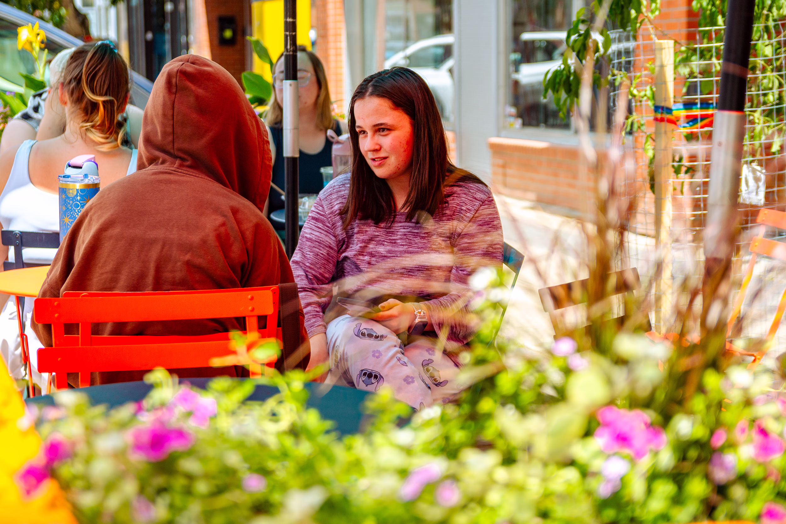 The plants on either end add to the colourful presence of this parklet while supporting urban pollinators.